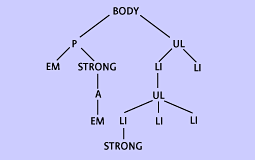 One example of adjacent siblings is the EM and STRONG elements within the paragraph. In fact, the only place in Figure 1 where elements don't have adjacent siblings is where they don't have any siblings at all, such as the A element; and in the unordered list with three LI children. There the first and third LI elements are not adjacent. The first and second are adjacent, as are the second and third, but the first and third are separated by the second and thus not adjacent.