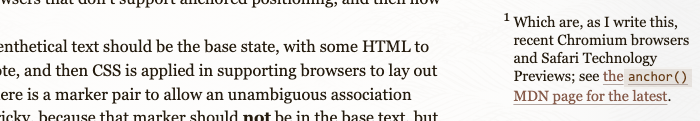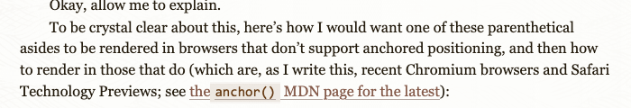 To be crystal clear about this, here’s how I would want one of these parenthetical asides to be rendered in browsers that don’t support anchored positioning, and then how to render in those that do (which are, as I write this, recent Chromium browsers and Safari Technology Previews; see theanchor() MDN page for the latest):
