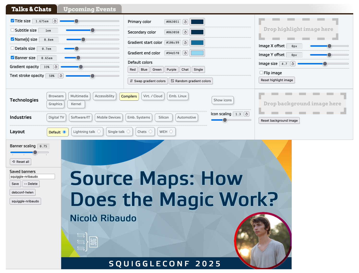 The text bits in the banner are all contenteditable HTML elements, and the various themes are managed with various blocks of CSS. (And yeah, those range inputs are all “super sliders”.) The point of all this being, I built it so that anyone at work could use it to make